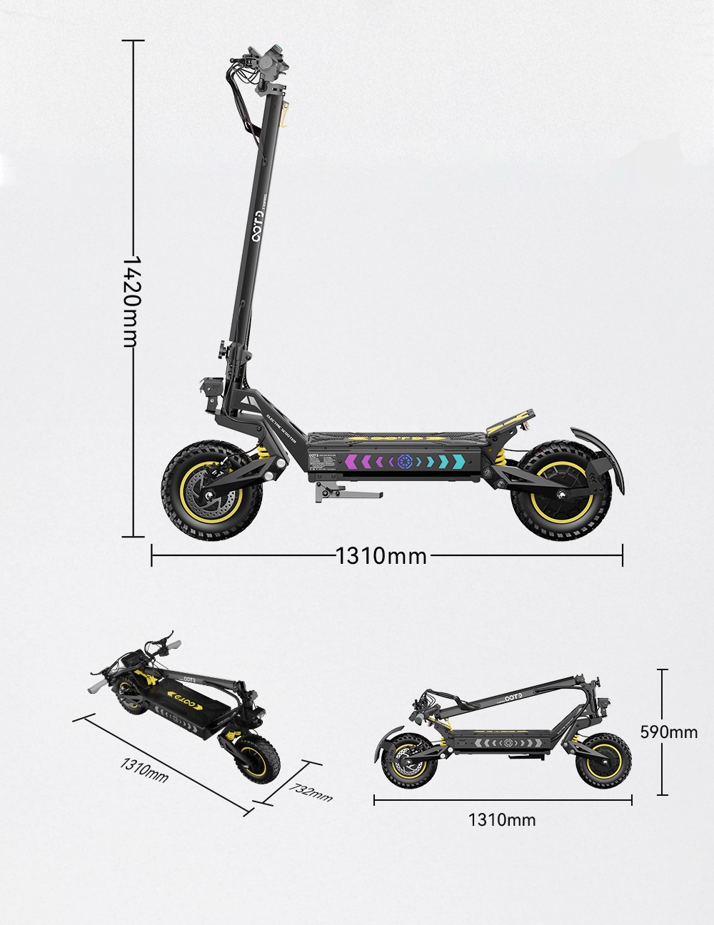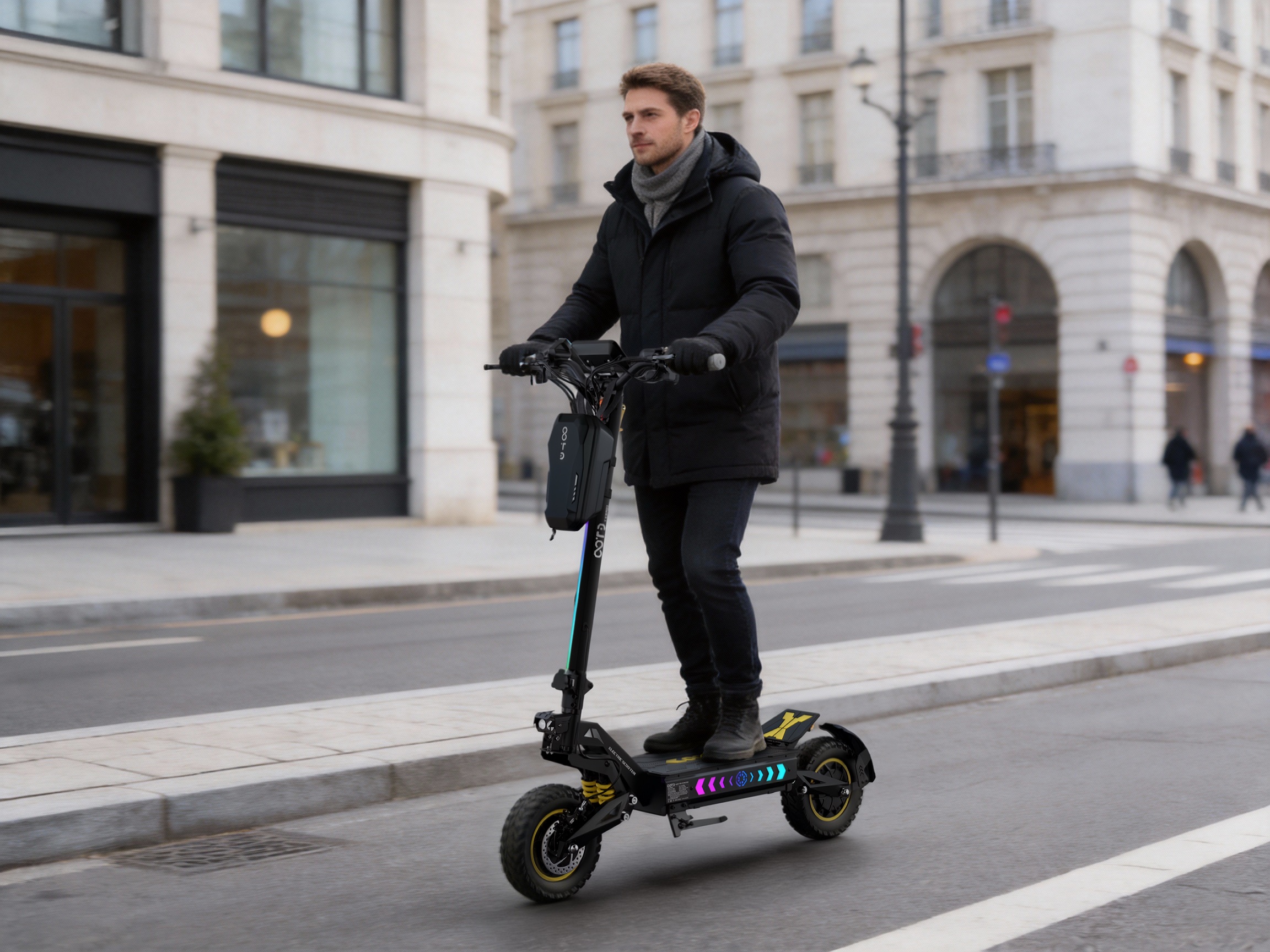 OOTD T10 Pro är en elektrisk scooter designad för hög prestanda och stabil körning. Den drivs av två motorer med upp till 1300 W vardera och ett 52 V 23,4 Ah batteri som ger god acceleration och lång räckvidd.
